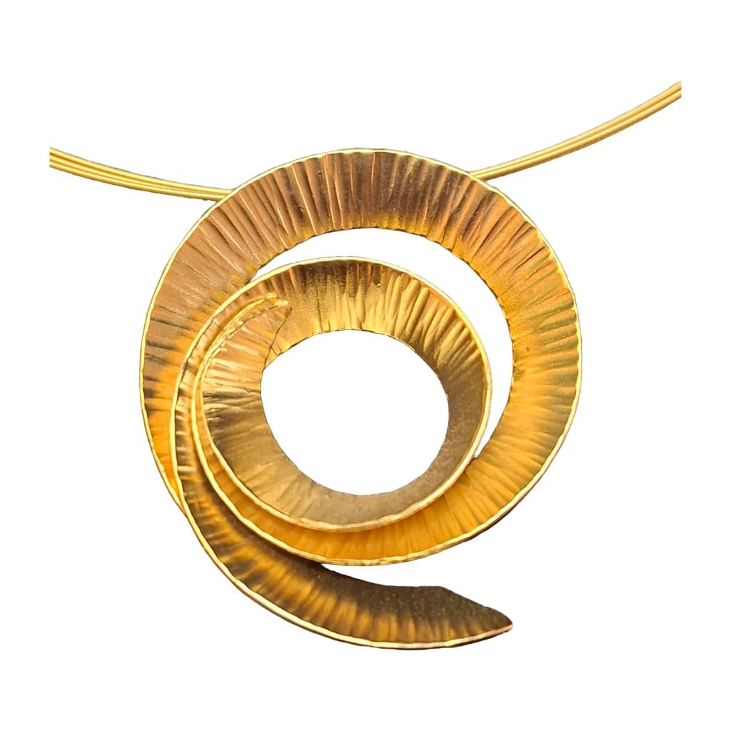 Χειροποίητο κολιέ από επιχρυσωμένο ορείχαλκο 18Κ, εμπνευσμένα από τη δύναμη της ευγνωμοσύνης και τη μαγεία της σουρεαλιστικής μορφής. Η αφηρημένη, γλυπτική φόρμα τους αποτυπώνει ένα σύμβολο που φέρνει ηρεμία και εσωτερική ισορροπία, ενώ ταυτόχρονα αγκαλιάζει το πρόσωπο με κομψότητα και λεπτότητα.Ένα κόσμημα που συνδυάζει την προσωπική ενέργεια με την καλλιτεχνική έκφραση