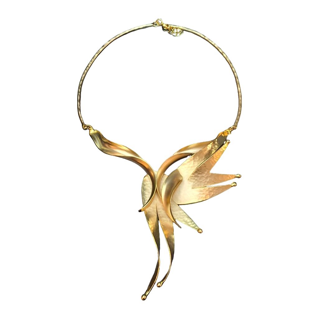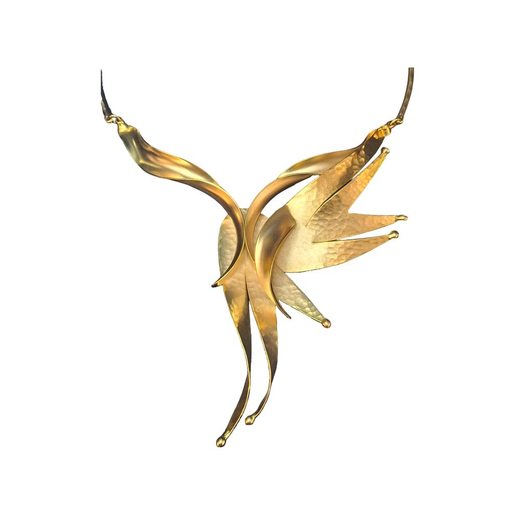 Ένα χειροποίητο κολιέ από επιχρυσωμένο ορείχαλκο 18Κ, εμπνευσμένο από τις ουρές των χελιδονιών — λεπτές, δυναμικές και γεμάτες κίνηση. Οι φόρμες τους πλέκονται σουρεαλιστικά, δημιουργώντας μια αέρινη σύνθεση. Η λάμψη του μετάλλου συναντά την ελαφρότητα της μορφής, μετατρέποντας το κόσμημα σε σύμβολο ελευθερίας και χάρης — μια γλυπτική στιγμή ανάμεσα στον ουρανό και τη φαντασία.